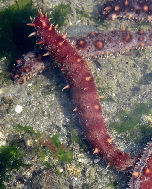 As typically happens, we were looking around in the shallows of a bay at low tide. Our giant dog, Pearl, seemed mystified as she encountered sea cucumbers.