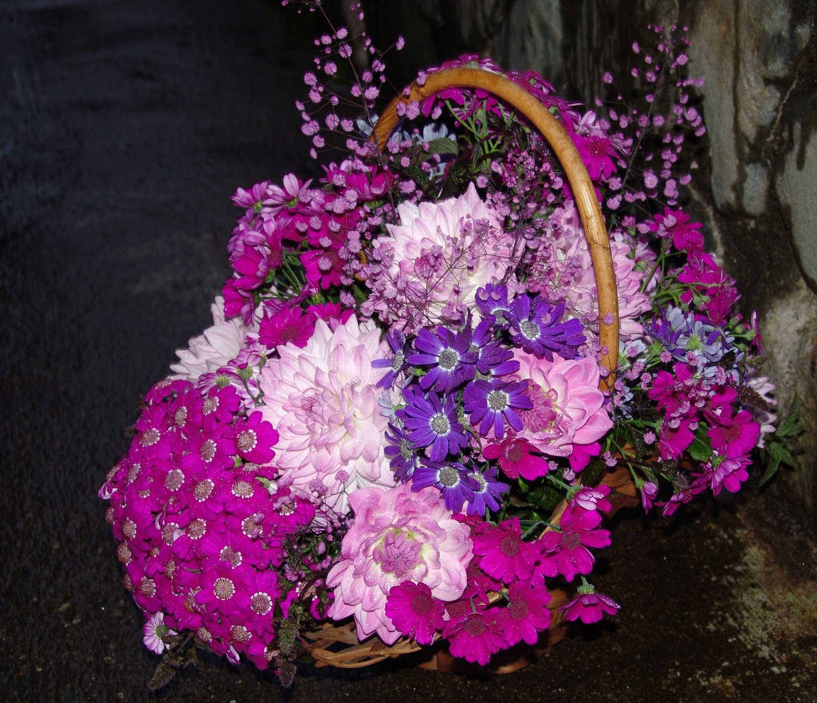 | PINK DAHLIAS PINK AND PURPLE CINERARIA TINY PURPLE MEADOW RUE |